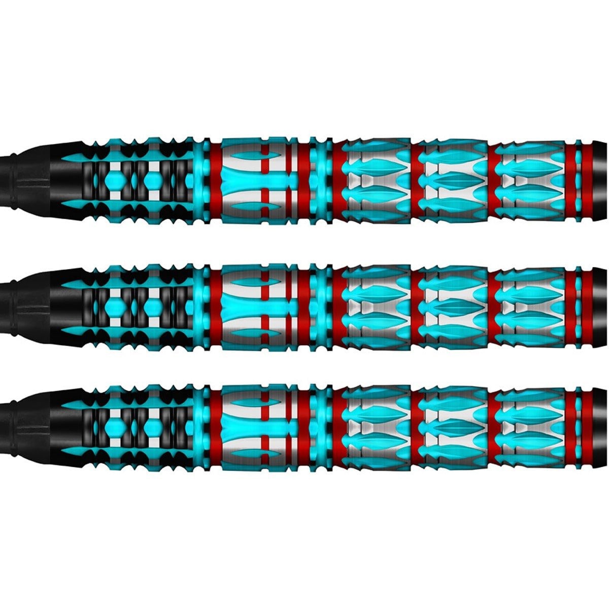Der Shot Future Knights St. George Steeldart überzeugt mit einem torpedoförmigen Barrel aus 95% Tungsten und einer ausgewogenen Balance. Direkt hinter der Spitze beginnt eine kompakte Kombination aus Axial-, Ring- und Sharkgrip, während sich ein Gripbereich mit stilvollen Elementen im mittelalterlichen Design anschließt. Die eingefrästen Ringe leuchten in einem satten Rot, dazwischen liegen längliche, türkisfarbene Vertiefungen in Form mittelalterlicher Symbole. Diese Sektionen reichen bis zum Barrelende und gewährleisten durchgehend guten Grip sowie maximale Kontrolle.